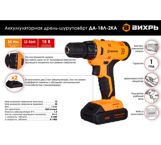 Аккумуляторная дрель-шуруповерт Вихрь ДА-18Л-2КА 72/14/25