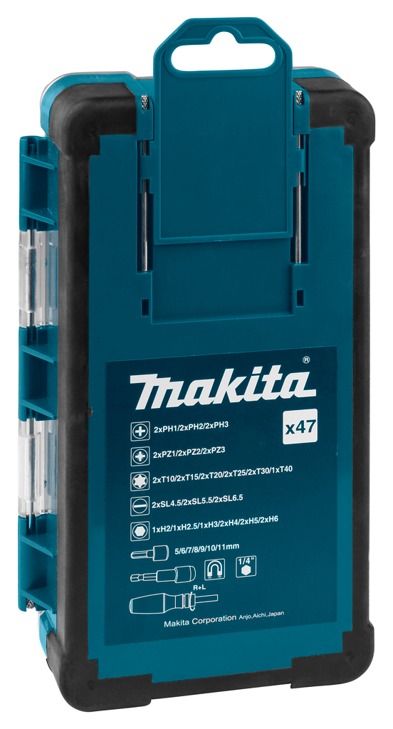 В набор оснастки Макита В-36170 входит: Бита 25 мм: - PH1, PH2, PH3 (2 шт.) - PZ1, PZ2, PZ3 (2 шт.) - TX10, TX15, TX20, TX30 (2 шт) - TX40 (1шт) - SL4.5, SL5.5, SL6.5 (2 шт) - H2, H2.5, H3 (1 шт) - H4, H6 (2 шт) -H5 (5 шт); Торцевые головки, 1 шт.: 5/6/7/8/9/10/11 мм; Магнитный держатель (1 шт); Отвертка с реверсом (1 шт).