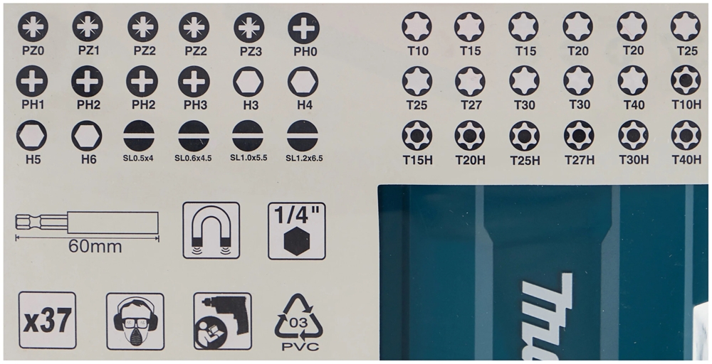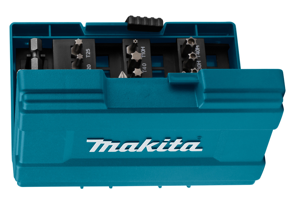 Набор насадок Makita B-28606 состоит из 37 предметов. Включает в себя 36 бит и магнитный держатель. Насадки упакованы в закрывающийся пластиковый пенал. Биты имеют длину 25 мм. Особенность набора состоит в том, что места для бит подписаны и их можно будет заменять на новые, не путая места.