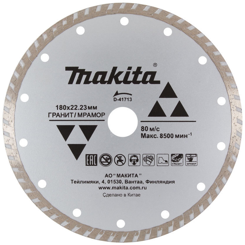 Алмазный диск предназначен для работ по мрамору и граниту. Диск отлично подходит для быстрой и стабильной резки. Купить - Диск алмазный по мрамору и граниту, 180x22.23 мм, сухая резка Makita D-41713 для УШМ, по выгодной цене очень просто, достаточно положить товар в «корзину» и оформить заказ или позвонить нам по телефону, так же можно для Вашего удобства, отправить заявку на Е-майл.