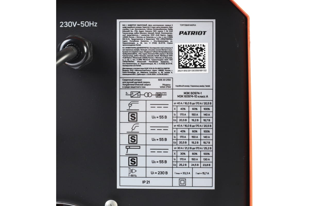 Сварочный инверторный полуавтомат PATRIOT WMA 175M MIG/MAG/MMA, полуавтоматическая сварка в среде 605302150