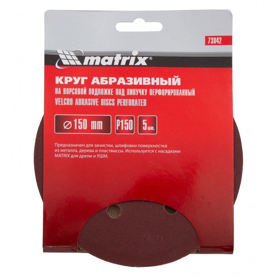 Круг абразивный на ворсовой подложке под липучку, перфорированный, P 150, 150 мм, 5 шт Matrix 73842