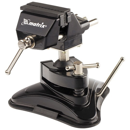 Настольные тиски Matrix 18506 с резиновой вакуумной присоской и шарнирным механизмом, шириной рабочих губок 70 мм, используются для фиксации обрабатываемых деталей. Расстояние между губками регулируется до 50 мм, что позволяет закреплять небольшие заготовки при осуществлении ювелирных, ремонтных и других тонких работ.