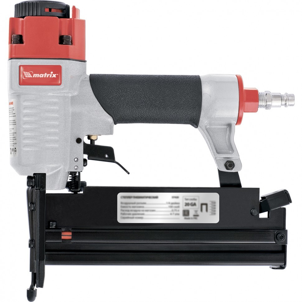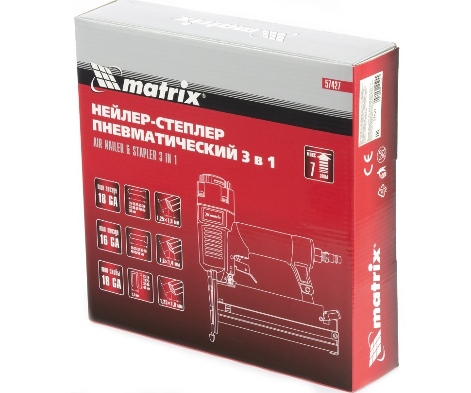Универсальный пневматический нейлер-степлер Matrix 3 в 1 способен забивать скобы 18 GA и гвозди 18GA и 16GA. Используется для паркетной доски, фанеры, ДВП, шифера, гипсокартона, ткани и бумаги. Также он пригодится при сборке мебели, ремонте и отделке. Нейлер-степлер экономично расходует воздух 107 л/мин, поэтому его можно подключать к любому типу компрессоров.