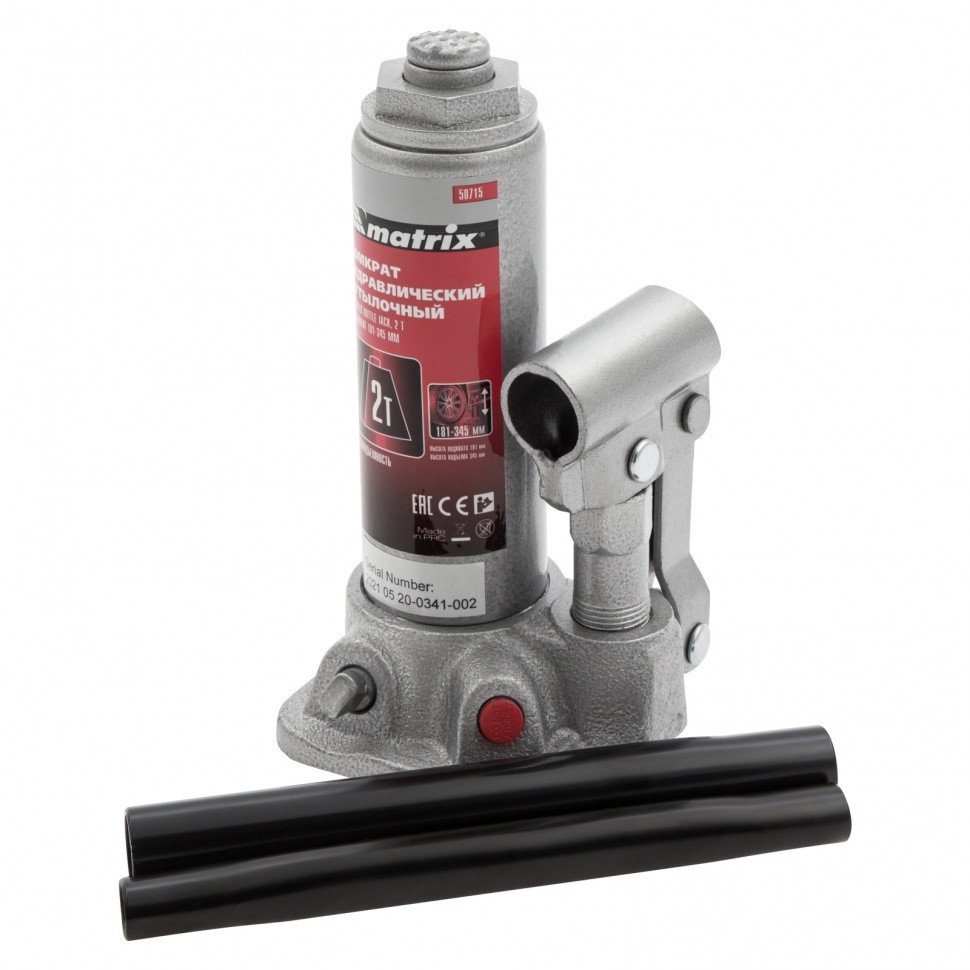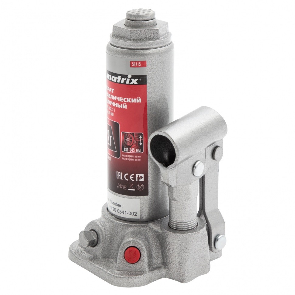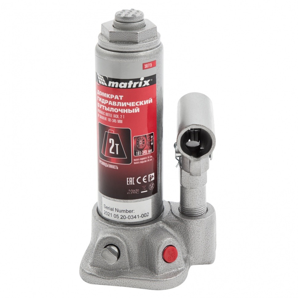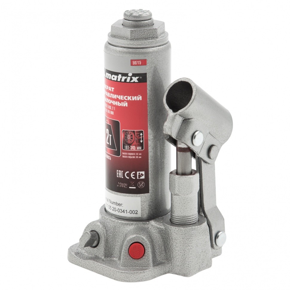Гидравлический бутылочный домкрат Matrix 50715 используется для поднятия и фиксации грузов весом до 2 т на высоту 181-345 мм. Он подходит для автомобилей с высоким клиренсом. Домкрат станет незаменимым помощником для автолюбителей в гараже и дороге, а также для профессионалов на СТО.