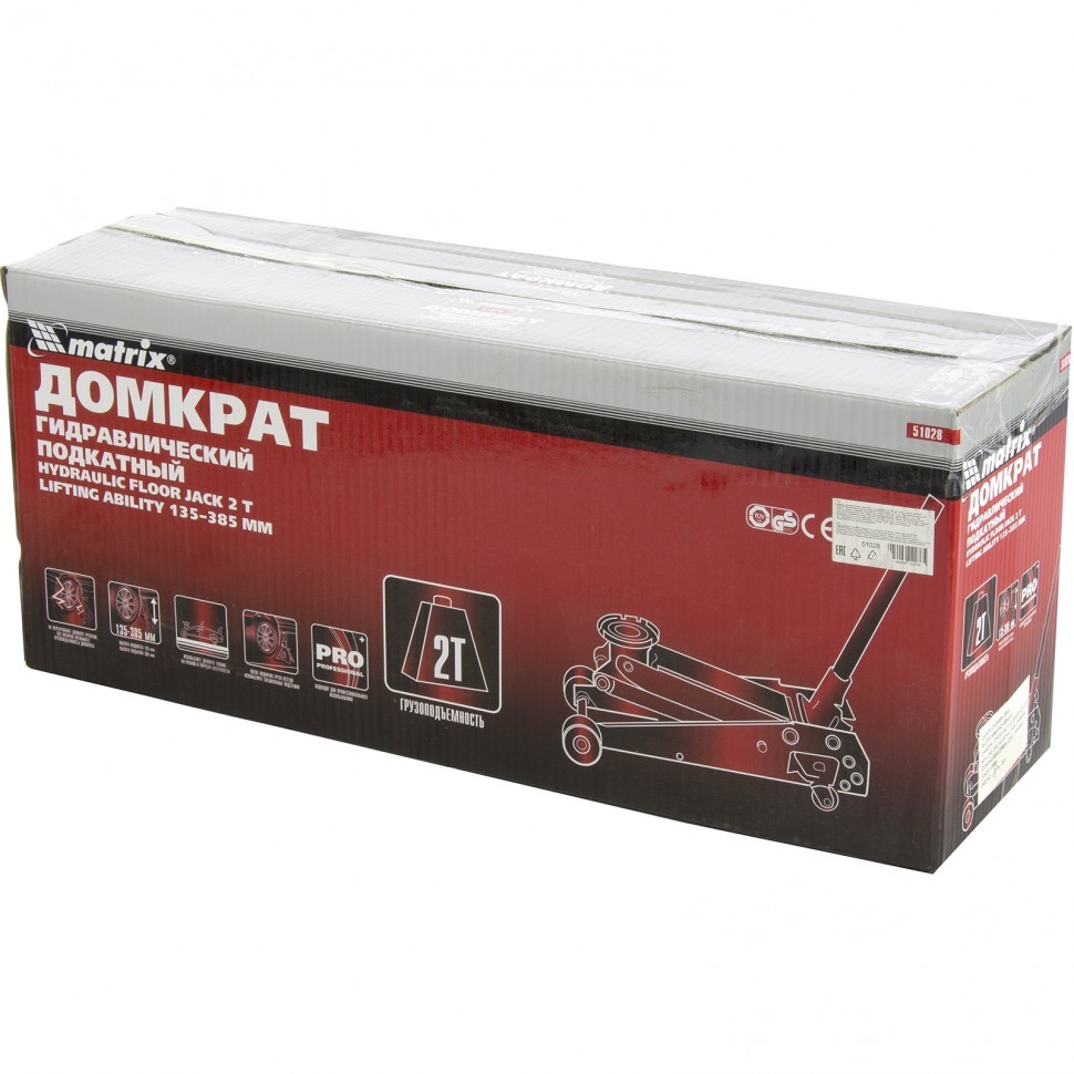 Подкатной гидравлический домкрат Matrix 51028 в пластиковом кейсе, h подъема 135-385 мм, - полупрофессиональное гаражное оборудование, способное поднимать груз массой до 2 т. Высота подхвата 135 мм позволяет использовать домкрат для автомашин со стандартным клиренсом. Высота подъема составляет 385 мм. Домкрат будет полезен как в автомастерской, так и в частном гараже.