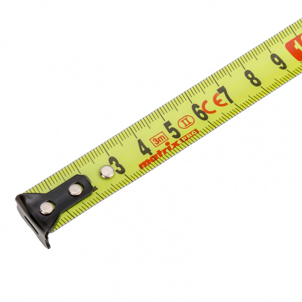 Рулетка Matrix PRO Neon 32590, 3 м х 16 мм, в обрезиненном корпусе, с 3 механизмами фиксации, служит для определения расстояний и размеров различных предметов. Крупные цифры на матовом желто-зеленом полотне хорошо видны, что делает процесс измерения комфортным. Измерительное полотно можно зафиксировать на нужной отметке при помощи стопора или одной из двух кнопок-пауз — это удобно при проведении большого количества замеров. Рулетка предназначена для выполнения профессиональных и бытовых измерительных работ.