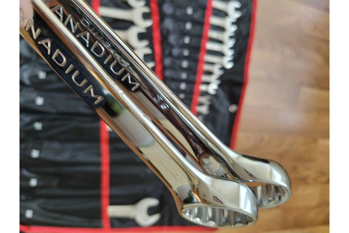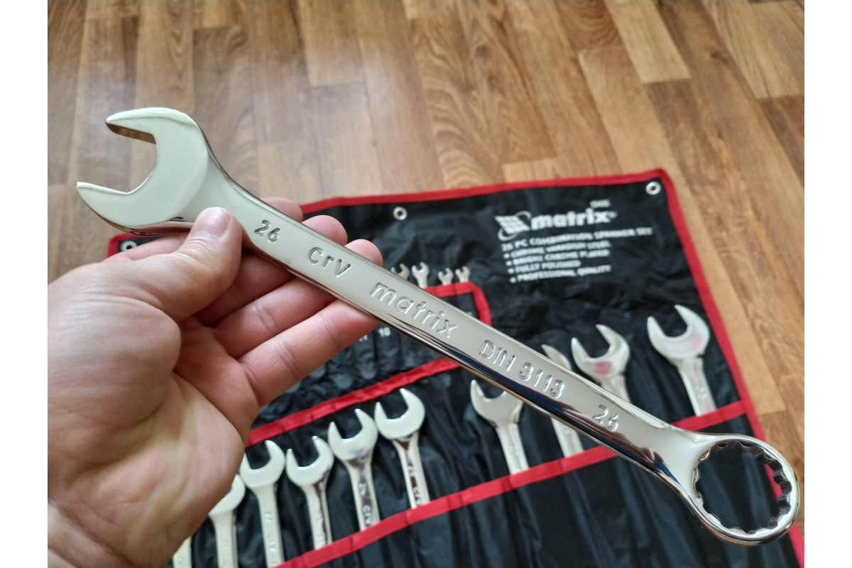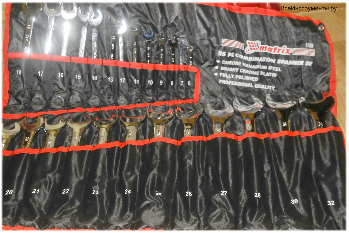 Набор комбинированных ключей, 6 - 32 мм, 25 шт., MATRIX 15425 предназначен для ремонтных работ, когда необходимо осуществить монтаж или демонтаж резьбовых соединений. Изготовлен из хромованадиевой стали и имеет хромоникелевое покрытие, что обеспечивает высокую прочность и долговечность. Твердость материала соответствует ГОСТу (48 HRс). Профиль каждого ключа имеет двенадцать граней, что обеспечивает больший захват рабочей поверхности. Головка ключа находится под углом 15° к основной оси, что делает работу более эффективной. Для удобства хранения и транспортировки предусмотрен чехол, в котором каждый ключ находится в отдельном кармане.