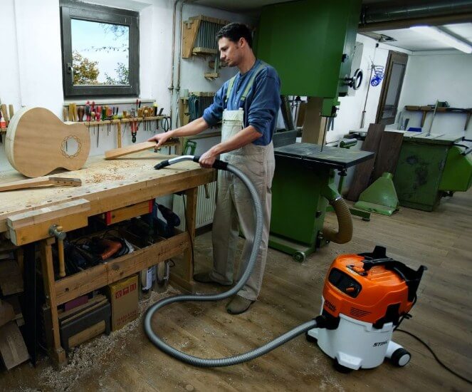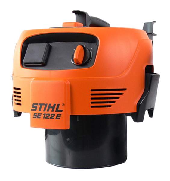 Высокопроизводительный пылесос STIHL SE 122 E (47740124405) для сухой и влажной уборки. Регулировкой частоты вращения и плавным пуском. С функцией автоматического включения и розеткой для подключения электроинструмента. Пылесос автоматически включается и выключается при включении и выключении электроинструмента.