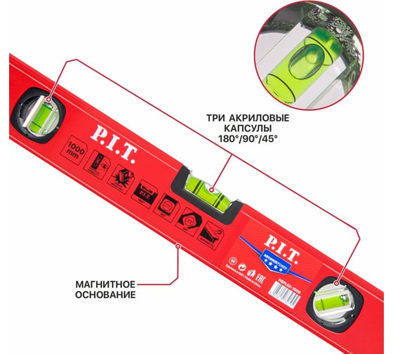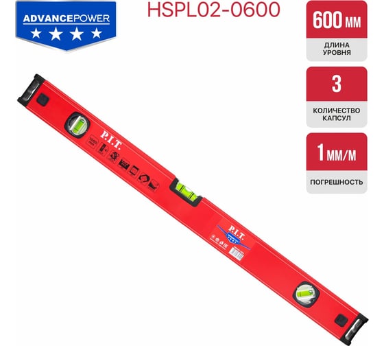 Уровень пузырьковый магнитный P.I.T. серия ADVANCE 600 мм, 3 капсулы, коробчатый, 1мм/м HSPL02-0600