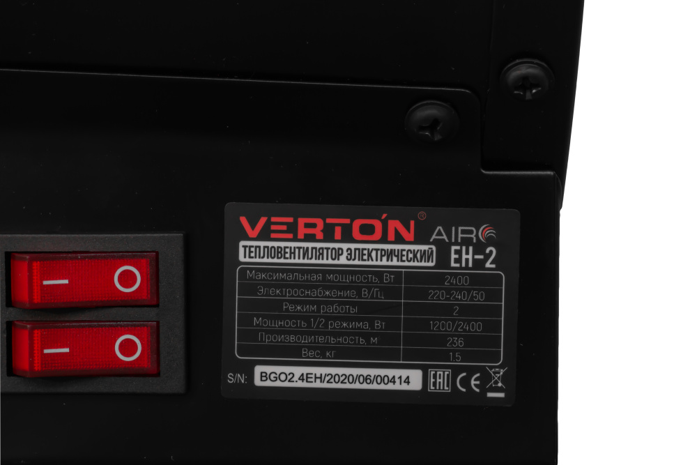 Электрический тепловентилятор Verton Air EH-2 ( 220В,1200/2400Вт,236 куб.м) 01.5985.9578