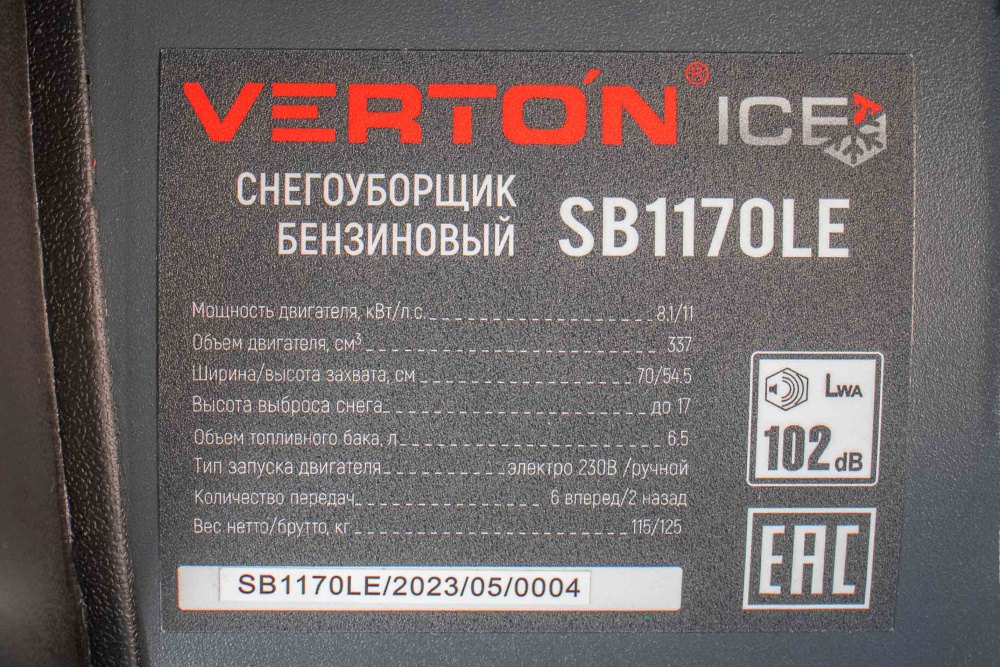 Снегоуборочная машина бенз.Verton Ice SB-1170 LE (Мощность 8,1кВт/11л.с,V двигателя 337см3, ширина/высота захвата 70/54см,кол-во передач:6 вперед/2 назад) 01.5985.7274