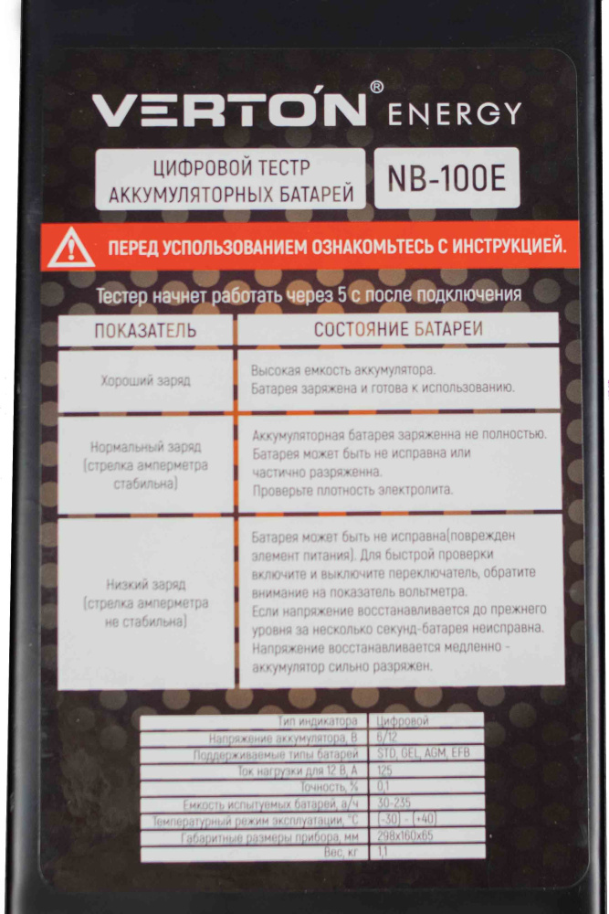 Нагрузочная вилка VERTON Energy NB-100E (наряж аккум. 8/12 В,ток нагрузки в реж. 12В - 125 Ам,емкость испытуемых батарей 30-235 А/ч, цифровой) 10 шт/кор 01.9670.9907