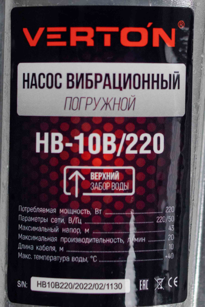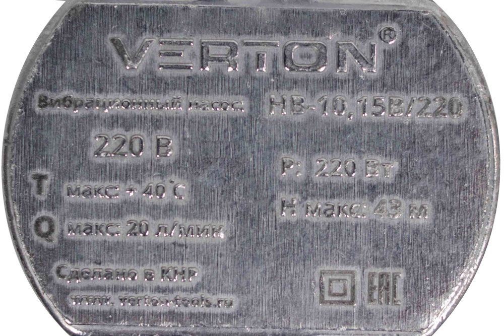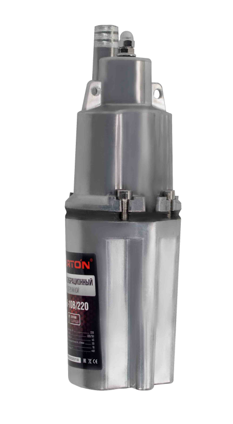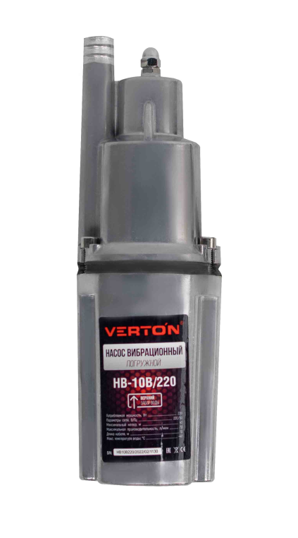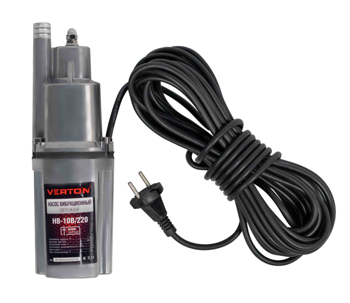 Насос вибрационный Verton НВ-10В/220 (220В, 220 Вт,D-76мм,произв. 20 л/мин.,глуб.погруж. 4 м,,верхний забор воды, длина эл.каб. 10м., макс. темп. 50 С, макс. напор 43 м. 6 шт/кор) 01.10945.10951