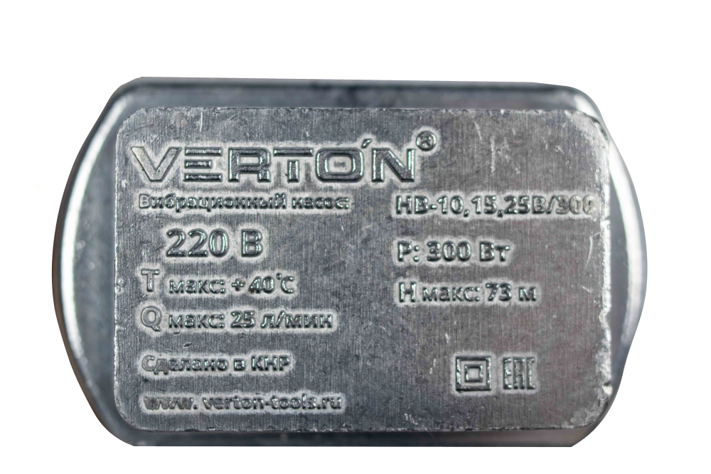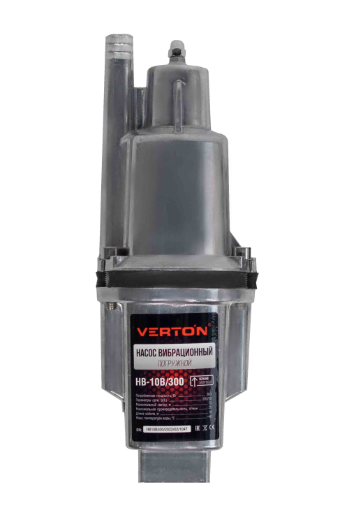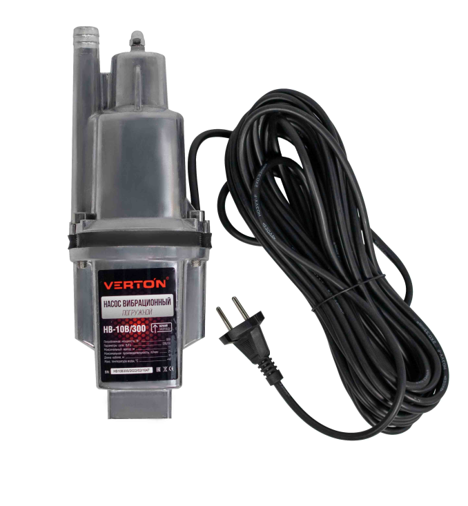 Насос вибрационный Verton НВ-10В/300 (220В,300 Вт,D-100мм, произв. 25 л/мин.,глуб. погруж. 4м., верхний забор воды, длина эл. каб. 10м, макс. темп. 50 С, макс. напор 73 м. (6шт/кор)) 01.10945.10946
