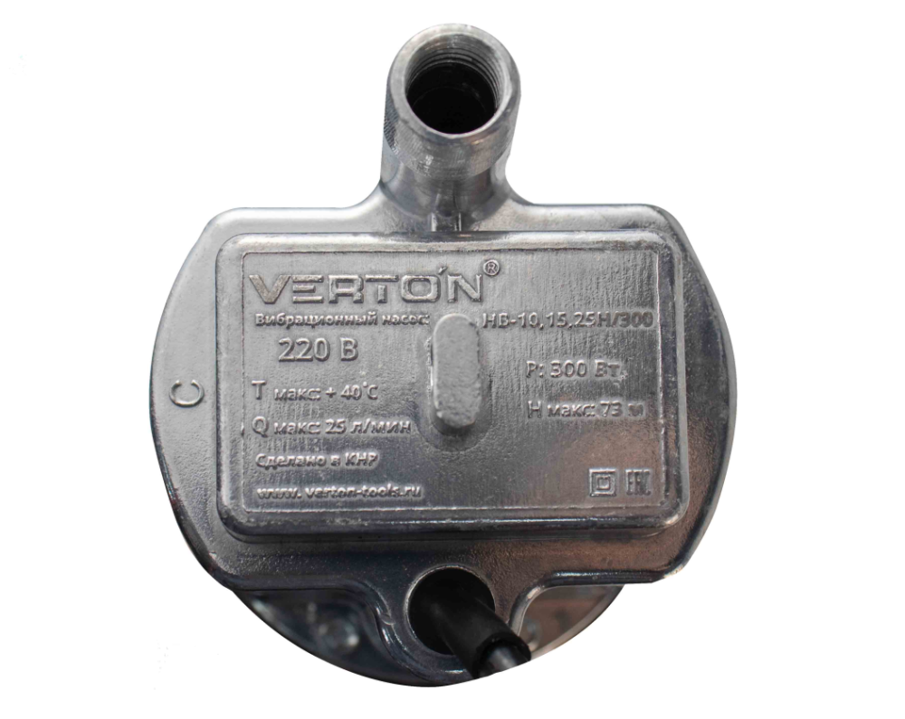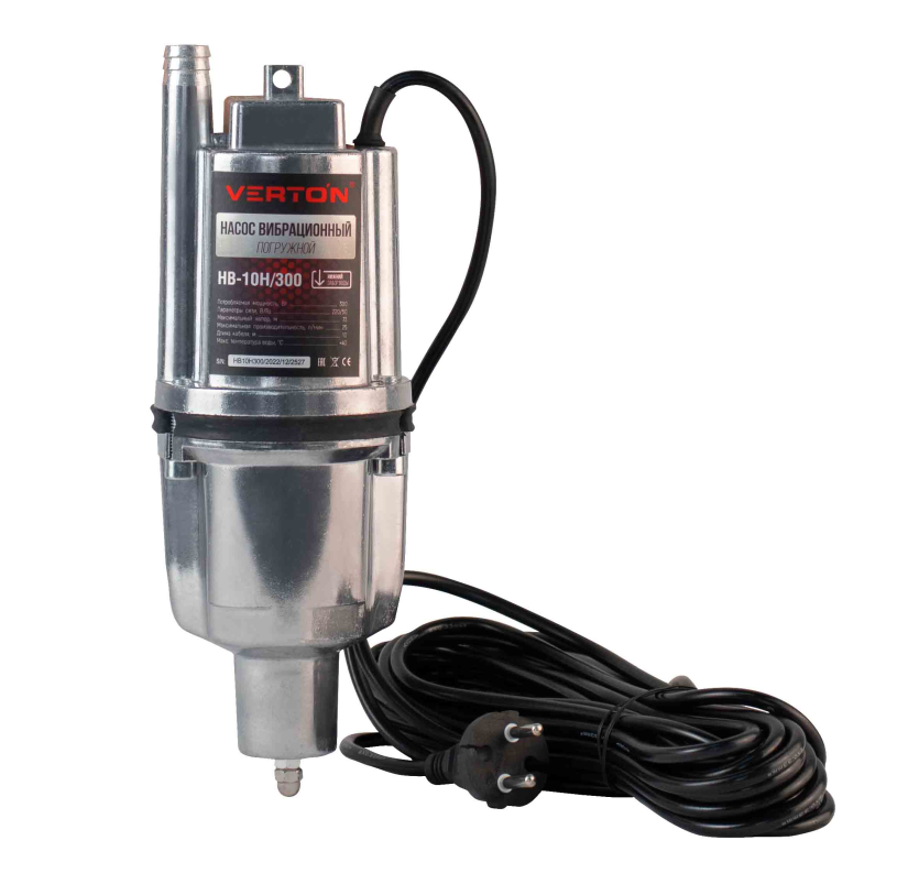 Насос вибрационный Verton НВ-10Н/300 (220В, 300 Вт,D-100мм,произв. 25 л/мин, глуб. погруж. 4м., нижний забор воды,длина эл.каб. 10м., макс. темп. 50 С, макс. напор 73 м. (6шт/кор)) 01.10945.10952