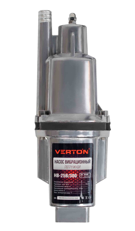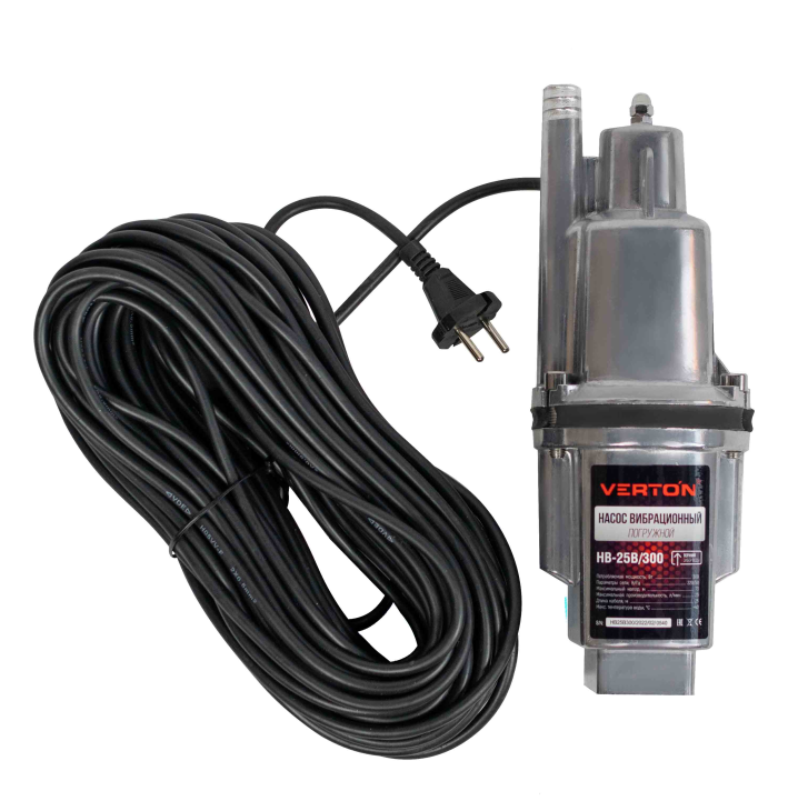 Насос вибрационный Verton НВ-25В/300 (220В, 300 Вт,D-100 мм, произв. 25 л/мин. глуб. погруж. 4 м., длина эл. каб. 25 м, верхний забор воды, макс. темп. 50 С, макс. напор 73 м. (4шт/кор)) 01.10945.10949