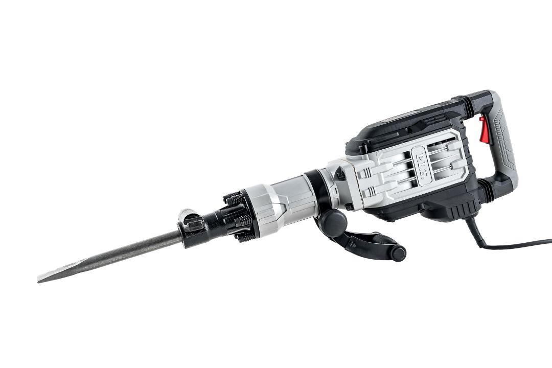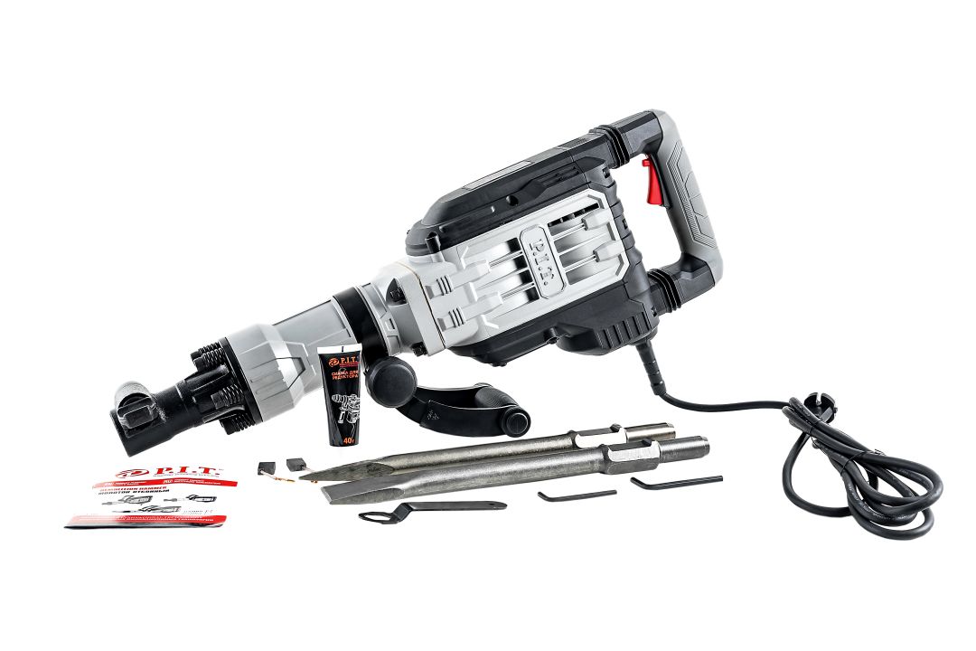 Молоток отбойный, пластиковый чемодан, зубило плоское, зубило пикообразное, щетки угольные, ключ торцевой, ключ шестигранный (2 шт), смазка для редуктора, руководство по эксплуатации