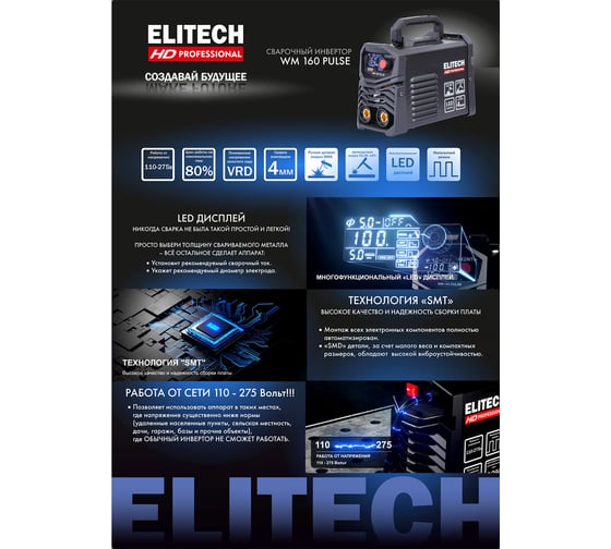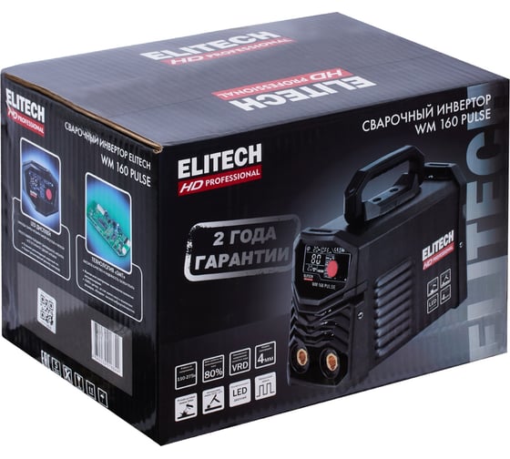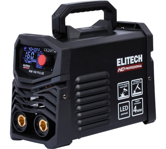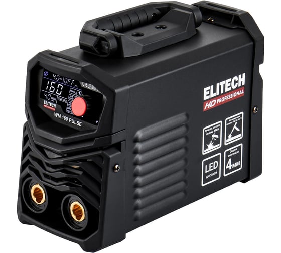 ELITECH «HD PROFESSIONAL» - серия инструментов для интенсивной работы, требующей высочайшей точности исполнения. Инструменты серии « HD PROFESSIONAL» сохраняют функциональность в экстремальных условиях окружающей среды. Они имеют максимальные степени защиты от перепадов температуры, влаги, пыли, перегрузок. Отличаются высокой ремонтопригодностью и высоким ресурсом. Созданы для профессионалов и для экстремальных условий.Сварочный аппарат ELITECH HD WM 160 PULSE мощностью 5 кВт предназначен для сварки стали (углеродистой и нержавеющей) на постоянном токе методом ручной электродуговой сварки (ММА) штучным электродом с флюсовым покрытием макс. диаметром 4 мм, а также методом аргонодуговой сварки (TIG) неплавящимся вольфрамовым электродом и присадочным прутком в среде инертного защитного газа - аргона.