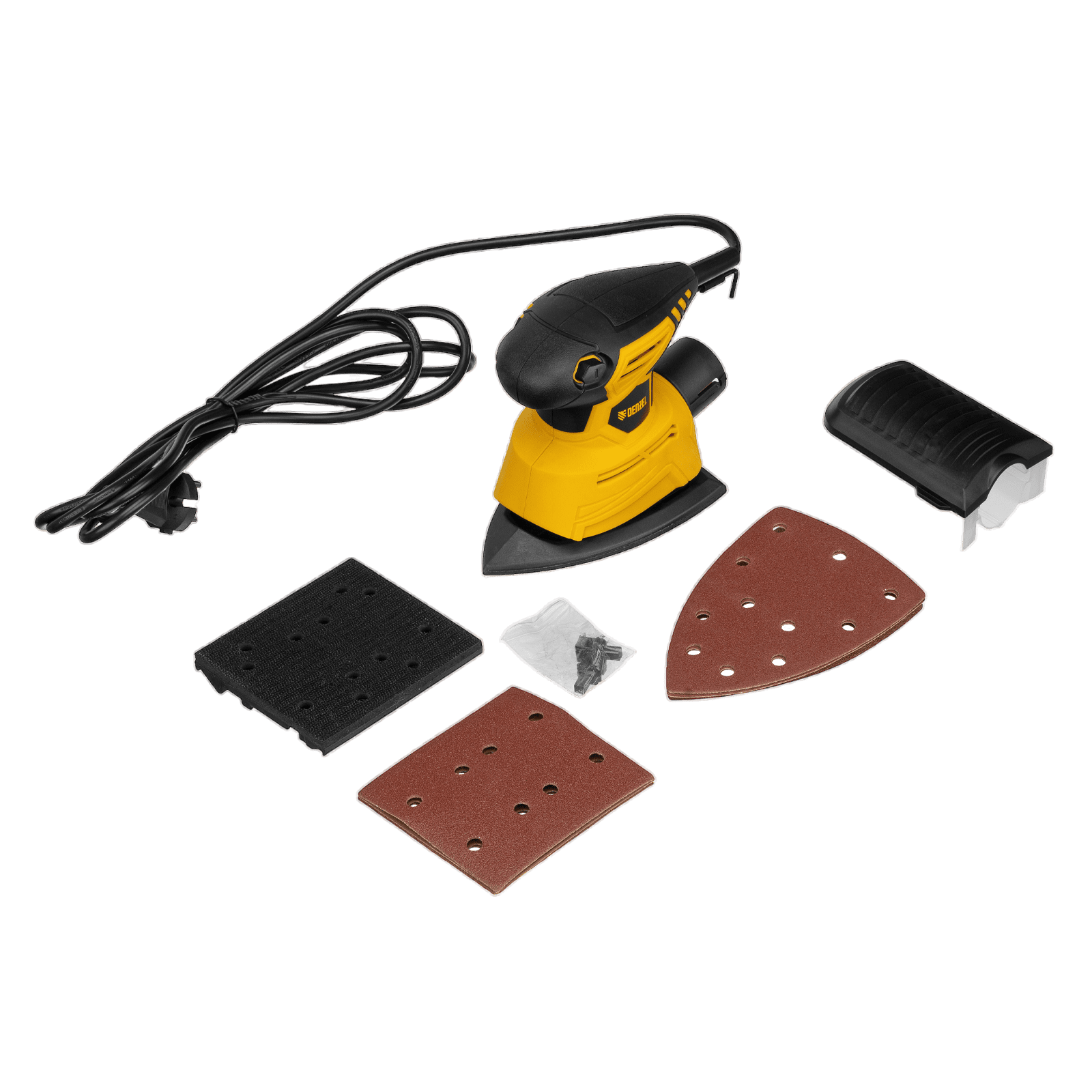 - Готовность к работе — в комплект входит 2 набора шлифовальной бумаги для прямоугольной и треугольной подошв, а также запасные угольные щётки.