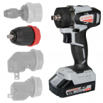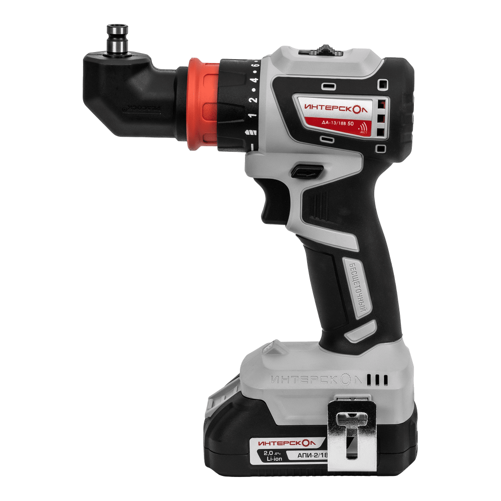Сверлильный патрон съемный, в шпинделе гнездо ¼” с магнитным креплением. Машина может работать, дополнительно, с тремя насадками:эксцентриковой, для работы вплотную в углахугловойнасадкой с механическим зажимом для хвостовиков HEX ¼”На угловую насадку может быть установлен патрон или насадка для механического крепления бит.Использование вентильного бесщеточного двигателя с цифровым управлением позволило получить энергетические характеристики машины, значительно превосходящие характеристики не только аккумуляторных машин с коллекторным приводом, но и сетевых аналогов, за счет более высокого КПД (выше на 30%). Это позволяет выполнять больше работы на одном заряде и таким образом экономить ресурс работы аккумуляторного блока.