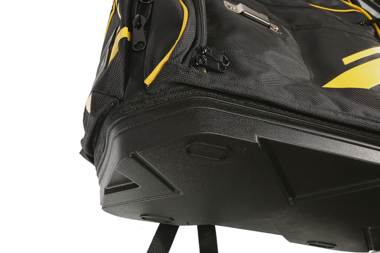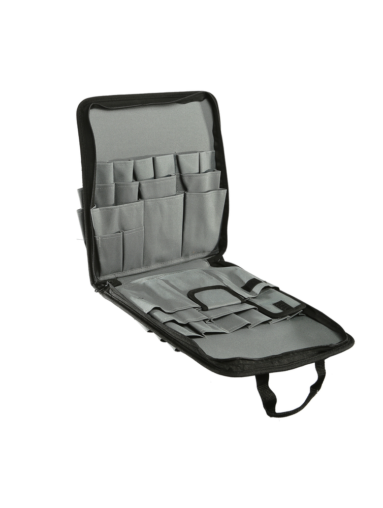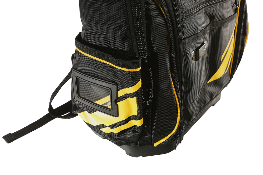 Оснащён кодовым замком для безопасного хранения инструмента внутри. 100% полиэстер выдерживает нагрузку в 30 кг, устойчив к растяжению и стиранию. Быстрая широкая молния позволяет мгновенно открыть рюкзак и получить доступ к инструменту. Съёмный органайзер во внутреннем отделе сумки помогает зонировать пространство для инструмента, а так же сам снабжен карманами. Возможность его извлечения позволяет полностью контролировать эргономику хранения инструмента. Дополнительные вставки в стенки и дно рюкзака позволяют ему лучше держать эргономичную форму при переноске инструментов. Удобная скоба для хранения рулетки обеспечивает быстрый доступ к ней. Сетчатая система вентиляции спинки рюкзака и текстурный рисунок контролируют отвод нагретого и насыщенного влагой воздуха. Этим предотвращается перегрев спины пользователя при переноске инструмента. Размеры 43x22x47см