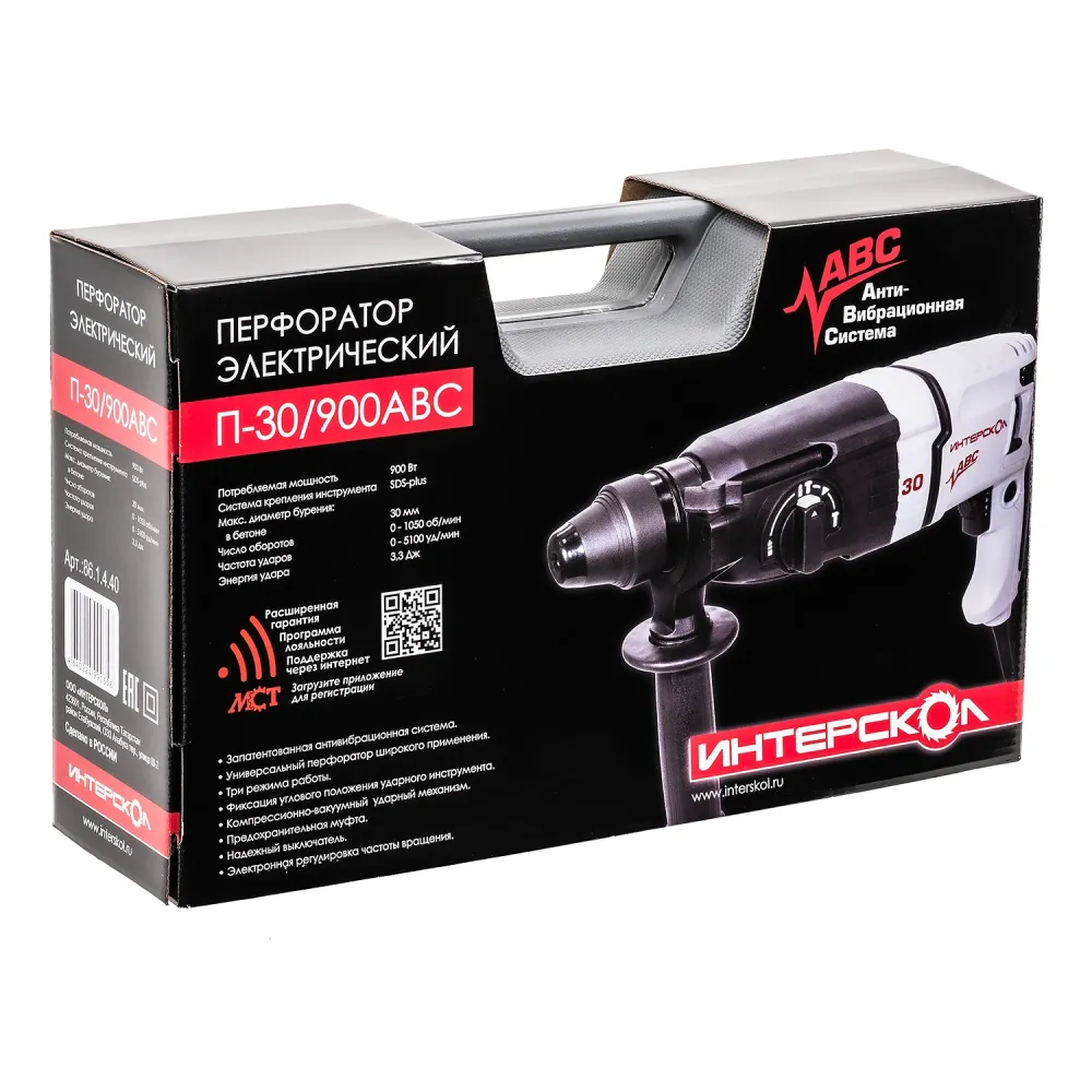 Перфоратор ИНТЕРСКОЛ П-30/900АВС, 900 Вт, 3.3 Дж, 5100 уд/мин, в кейсе () 86.1.4.40