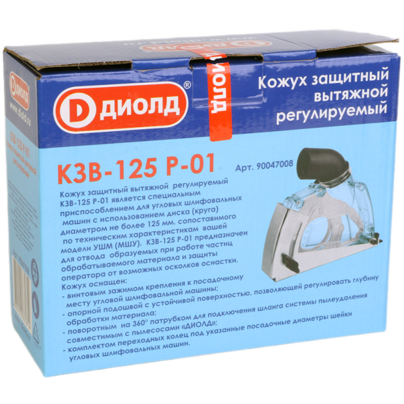 Кожух защитный вытяжной регулируемый КЗВ-125 Р-01 (в дальнейшем по тексту – кожух) является специальным приспособлением для угловых шлифовальных машин с использованием диска (круга) диаметром не более 125 мм. и сопоставимого по техническим характеристикам используемой модели машины.
