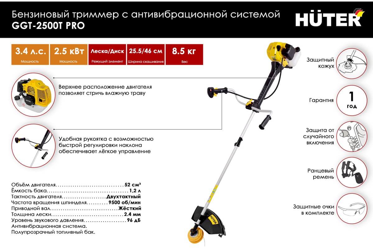Бензиновый триммер Huter GGT-2500Т PRO с антивибрационной системой 70/2/28