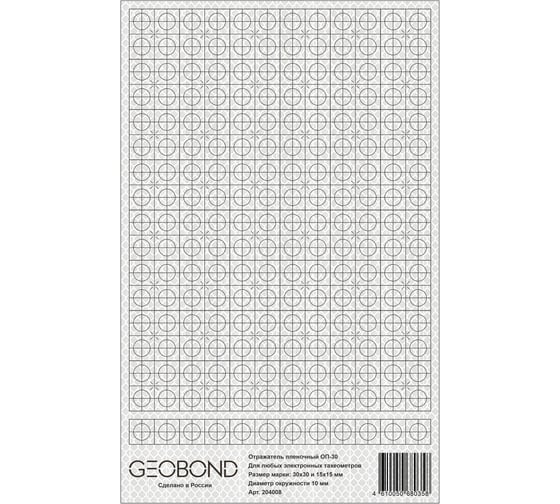 Отражатель ОП30 пленочный GEOBOND 204008 используется с тахеометрами любых производителей. Изготовлены отражатели из новейшей высококачественной пленки призматического типа со сверхвысокой световозвращающей эффективностью. Коэффициент отражения данной пленки RA составляет 600 (кд/лк/ м2), что позволяет производить измерения на расстояниях до 500 метров. Поставляются одним листом с возможностью выбора размера отражателя под свои нужды. Отражатели Geobond ОП-30 имеют оригинальную форму, которая позволяет автономно использовать марку либо целиком (30 х 30 мм 48шт), либо 1/4 ее часть (15 х 15 мм 208шт). Это создает дополнительные удобства, т. к., приобретая всего один тип пленочного отражателя, пользователь имеет возможность, оптимально подбирать необходимый размер марки в зависимости от расстояний, на которых планируются измерения. К достоинствам разметки относятся бисекторные и контрбисекторные штрихи различной толщины, значительно упрощающие наведение на них, а также повышающие точность взятия углового отсчета при работе на больших расстояниях. Разметка пленочного отражателя нанесена специальной водостойкой краской, выдерживающей воздействия спирта и бензина, а сама пленка имеет гарантированный срок службы при уличной эксплуатации 10 лет.