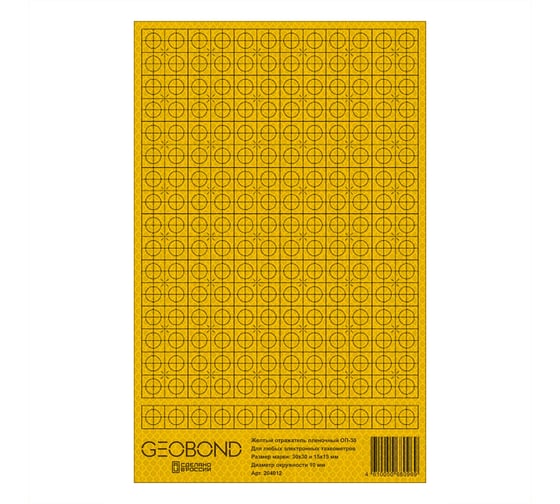 Желтые пленочные отражатели Geobond ОП-30 используются с тахеометрами любых производителей. Изготовлены отражатели из новейшей высококачественной пленки призматического типа со сверхвысокой световозвращающей эффективностью. Коэффициент отражения данной пленки RA составляет 600 (кд/лк/ м2), что позволяет производить измерения на расстояниях до 500 метров. Отражатели выполнены в желтом цвете, что позволяет лучше видеть их при работе. Поставляются одним листом с возможностью выбора размера отражателя под свои нужды. Отражатели Geobond ОП-30 имеют оригинальную форму, которая позволяет автономно использовать марку либо целиком (30 х 30 мм), либо 1/4 ее часть (15 х 15 мм). Это создает дополнительные удобства, т. к., приобретая всего один тип пленочного отражателя, пользователь имеет возможность, оптимально подбирать необходимый размер марки в зависимости от расстояний, на которых планируются измерения. К достоинствам разметки относятся бисекторные и контрбисекторные штрихи различной толщины, значительно упрощающие наведение на них, а также повышающие точность взятия углового отсчета при работе на больших расстояниях. Разметка пленочного отражателя нанесена специальной водостойкой краской, выдерживающей воздействия спирта и бензина.
