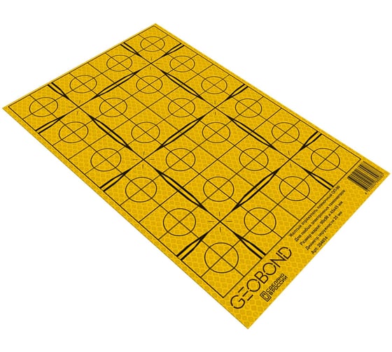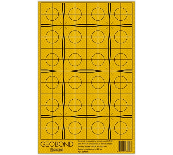 Желтые пленочные отражатели Geobond ОП-90 используются с тахеометрами любых производителей. Изготовлены отражатели из новейшей высококачественной пленки призматического типа со сверхвысокой световозвращающей эффективностью. Коэффициент отражения данной пленки RA составляет 600 (кд/лк/ м2), что позволяет производить измерения на расстояниях до 500 метров. Отражатели выполнены в желтом цвете, что позволяет лучше видеть их при работе. Поставляются одним листом с возможностью выбора размера отражателя под свои нужды. Отражатели Geobond ОП-90 имеют оригинальную форму, которая позволяет автономно использовать марку либо целиком (90 х 90 мм), либо 1/4 ее часть (45 х 45 мм). Это создает дополнительные удобства, т. к., приобретая всего один тип пленочного отражателя, пользователь имеет возможность, оптимально подбирать необходимый размер марки в зависимости от расстояний, на которых планируются измерения. К достоинствам разметки относятся бисекторные и контрбисекторные штрихи различной толщины, значительно упрощающие наведение на них, а также повышающие точность взятия углового отсчета при работе на больших расстояниях. Разметка пленочного отражателя нанесена специальной водостойкой краской, выдерживающей воздействия спирта и бензина.