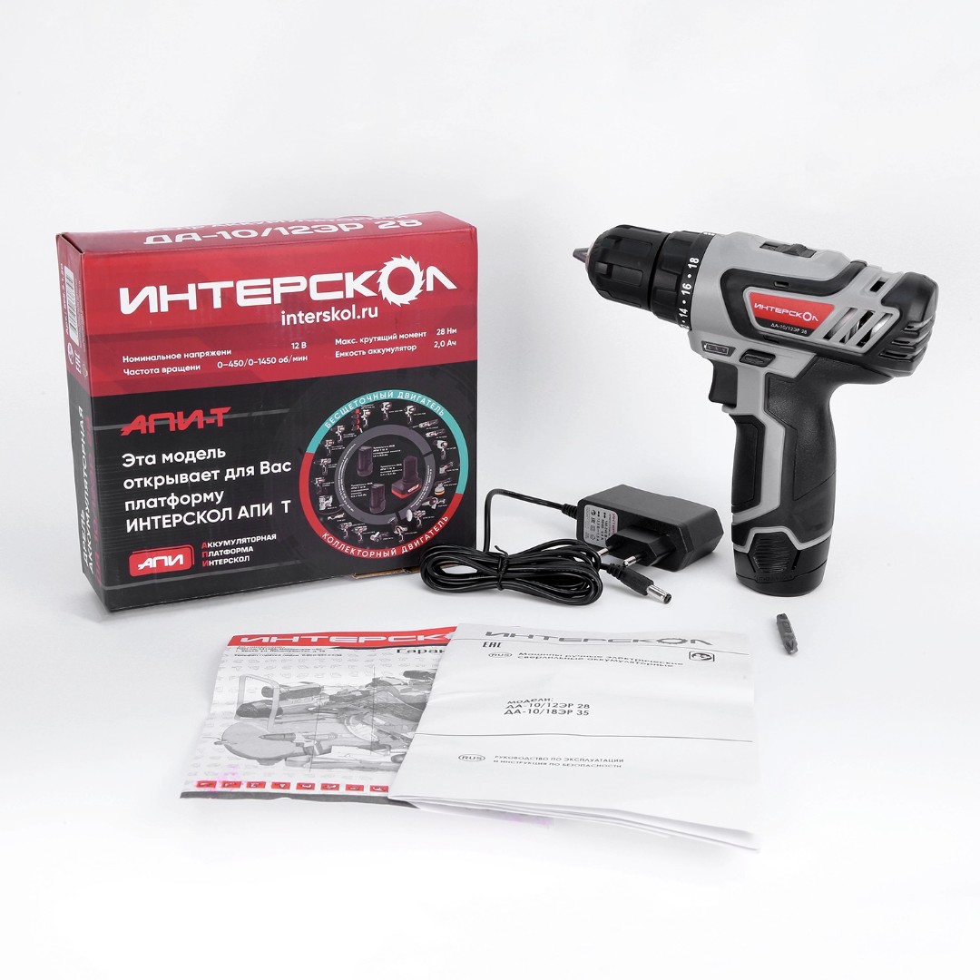Двухскоростная аккумуляторная дрель-шуруповерт ИНТЕРСКОЛ ДА-10/12ЭР 28 комплектуется высококачественными литийионными (Li-ion) аккумуляторными батареями единой универсальной платформы АПИ Т 12 В туннельного типа (размещаются внутри рукоятки инструмента), характеризующимися высокой энергоемкостью, практическим отсутствием саморазряда и эффекта памяти. Это позволяет сразу же приступить к работе даже после продолжительного хранения (аккумуляторы сохраняют заряд на протяжении долгого времени), а при необходимости в любой момент поставить батарею на подзарядку.