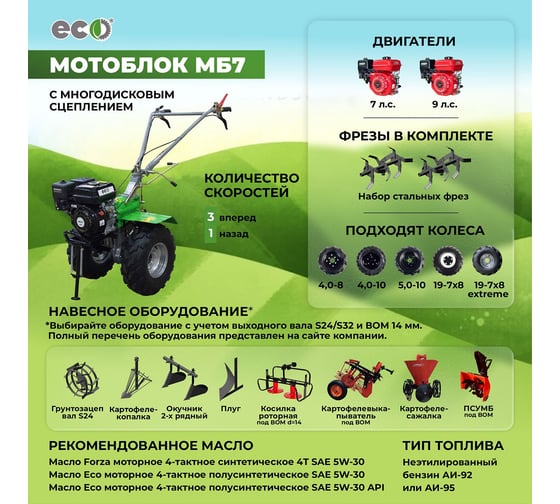 Мотоблок бензиновый ECO МБ7 902 9 л.с., ВОМ 14 мм, 3 вперед 1 назад, руль: поворотный, вал: S24, колеса: 19x7х8, фрезы: 3 группы 24 ножа ЕСОМБ7902